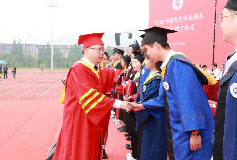 校党委领导班子成员王君松、曾庆田、郭益灵、刘明永、徐龙飞、徐方全、阳凡林、薛庆忠、诸葛福民、李克周、王震,学校相关部门及各学院主要负责人、导师代表、家长代表,以及全校2025届毕业研究生齐聚一堂,共同见证属于毕业生的高光时刻。